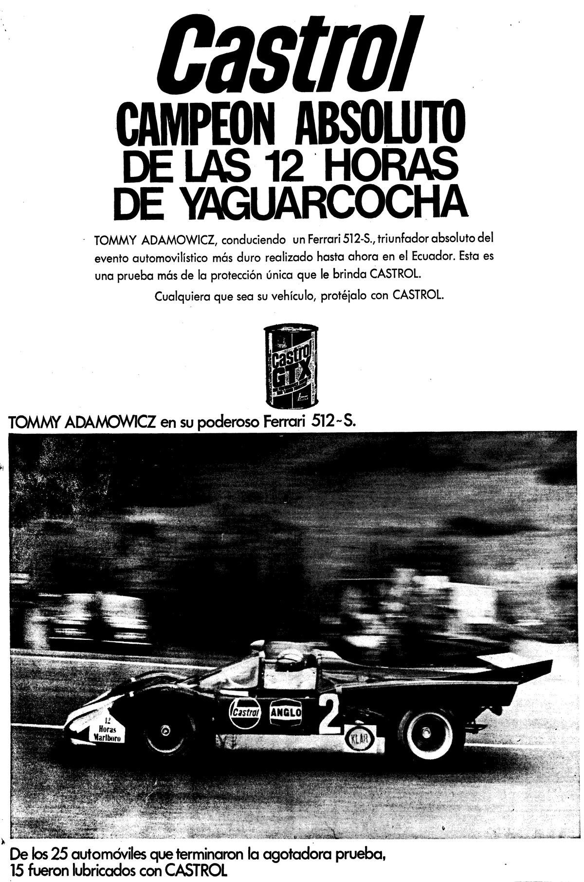 This is the fabulous Ferrari 512-S, which will participate in the “12 Hours” on Sunday. I arrived yesterday in Quito, by plane. It cost $78,000, so it is the most expensive car of the many that have arrived in Ecuador, and it develops a speed of 350 kilometers per hour. It will be guided by the American Tony Adamowicz.”